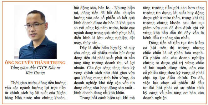 Thời gian trước, dòng tiền hướng vào các ngành hưởng lợi trực tiếp từ chính sách hạ lãi suất của Ngân hàng Nhà nước như chứng khoán, bất động sản, bán lẻ… Nhưng hiện tại, dòng tiền đã bắt đầu chuyển hướng vào các cổ phiếu có kết quả kinh doanh được dự báo là khả quan so với cùng kỳ năm trước, hoặc các ngành đang trong quá trình phục hồi, điển hình là khu công nghiệp, dệt may, thủy sản… Đây là diễn biến hợp lý, vì suy cho cùng, cổ phiếu muốn hút được dòng tiền thì phải xuất phát từ nền tảng tăng trưởng doanh thu và lợi nhuận. Các đợt sóng tăng theo kỳ vọng chính sách như thời gian vừa qua không mang tính bền vững, do doanh nghiệp khó tiếp cận vốn tín dụng cũng như hoạt động sản xuất - kinh doanh đang rất khó khăn. Trong bối cảnh hiện tại, khi mà tăng trưởng tiền gửi cao hơn tăng trưởng tín dụng, lãi suất huy động được giữ ở mức thấp, trong khi thị trường chứng khoán sau đợt sụt giảm vừa qua đã đưa định giá về vùng khá hấp dẫn thì đây vẫn là kênh đầu tư sáng sủa nhất. Dòng tiền sẽ tiếp tục tìm kiếm cơ hội trên thị trường nhưng chắc chắn là sẽ phân hóa mạnh. Cổ phiếu của các doanh nghiệp chứng tỏ được giá trị vững chắc sẽ hút mạnh dòng tiền, còn các cổ phiếu tăng theo kỳ vọng sẽ phải chịu áp lực điều chỉnh. Do đó, việc lựa chọn cổ phiếu để đầu tư đòi hỏi phải có sự phân tích kỹ càng về nền tảng cơ bản của doanh nghiệp.