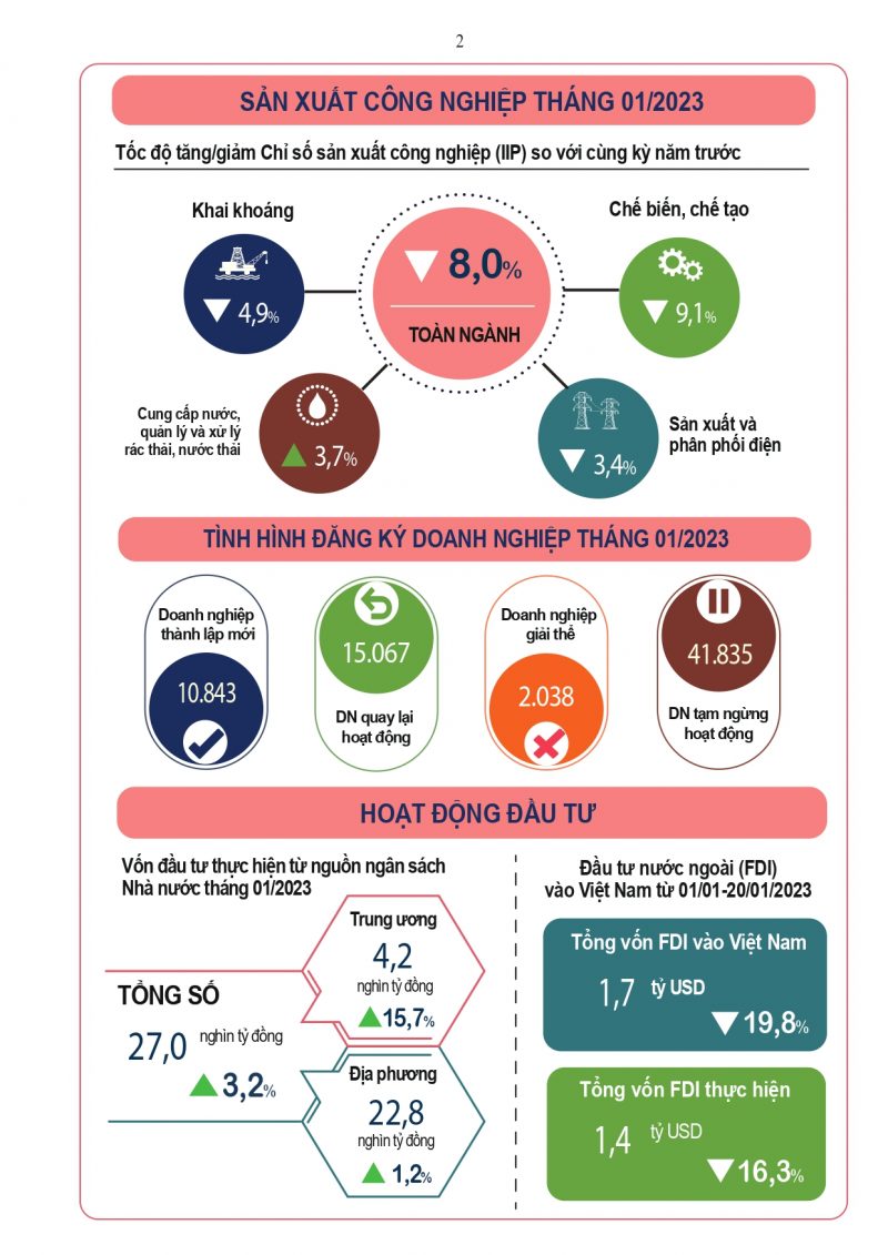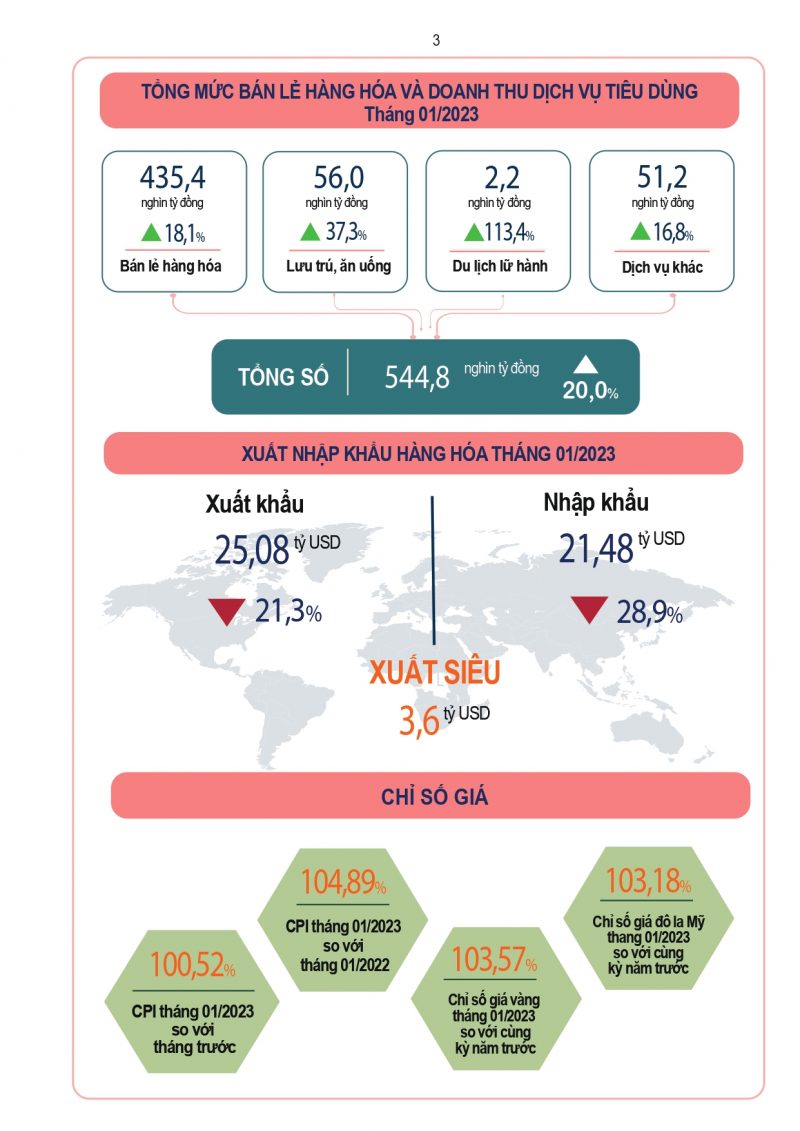 Ngoài ra, theo số liệu từ GSO, Tổng mức bán lẻ hàng hóa và dịch vụ tiêu dùng trong tháng 1 tăng 20%, đây có thể do nhu cầu tiêu dùng của người dân tăng trong dịp Tết Nguyên đán. Sự phục hồi trở lại của các hoạt động tiêu dùng, dịch vụ, du lịch đã đẩy CPI tháng 1/2023 tăng 4.89% khá cao so với cùng kỳ năm trước trong khi lạm phát cơ bản tăng 5,21% (do giá xăng dầu và giá dịch vụ giáo dục kiềm chế tốc độ tăng của CPI). Đây là điều đã được cảnh báo trước và sẽ gây áp lực lên mục tiêu kiểm soát lạm phát của năm 2023.