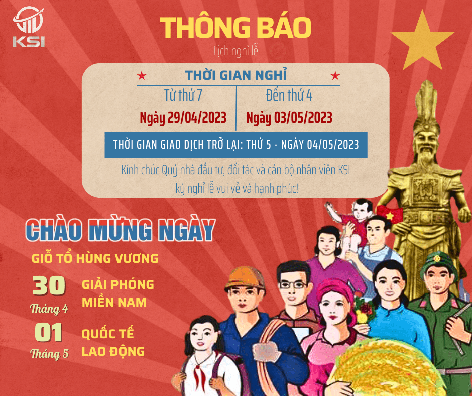 Hòa chung không khí vui tươi, phấn khởi trên toàn quốc nhân dịp kỉ niệm ngày Giỗ tổ Hùng Vương (10/03 ÂL), ngày Giải phóng miền Nam (30/04) và ngày Quốc tế Lao động (01/05); thực hiện theo quy định của Luật Lao động và thông báo của Sở Giao dịch Chứng khoán TP Hồ Chí Minh, Sở giao dịch Chứng khoán Hà Nội và Trung tâm lưu ký Chứng khoán Việt Nam về việc nghỉ giao dịch nhân dịp Đại lễ, KSI xin trân trọng thông báo đến Quý nhà đầu tư lịch nghỉ giao dịch như sau:
